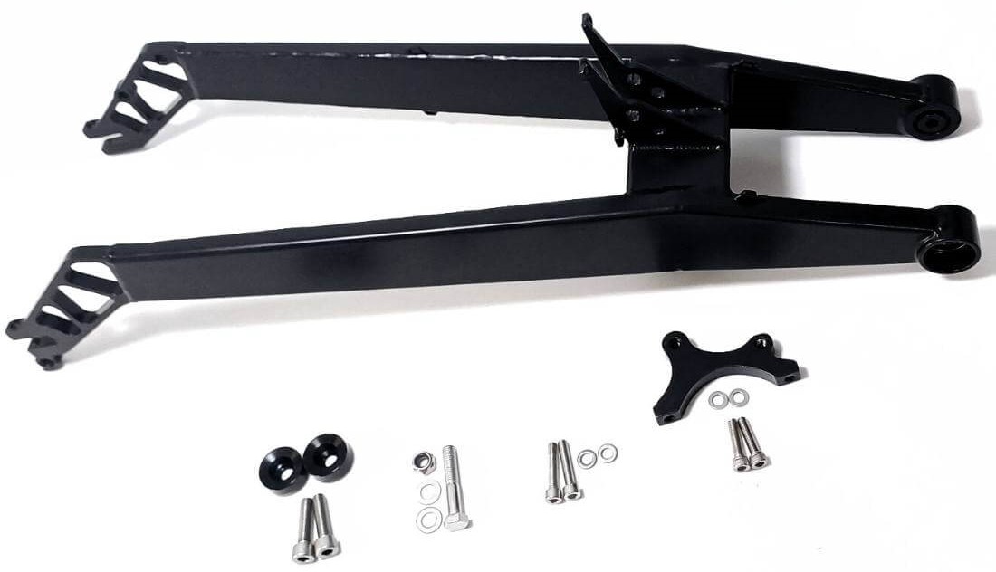 Poleg tega nihajna roka vključuje nosilec zavorne čeljusti, ki je združljiv z 203 mm zavornimi diski. Za pravilno nastavitev zavore lahko uporabite distančnike za nosilec zavorne čeljusti, s katerimi dosežete ustrezen razmik. Ti distančniki so na voljo ločeno in niso vključeni v komplet.