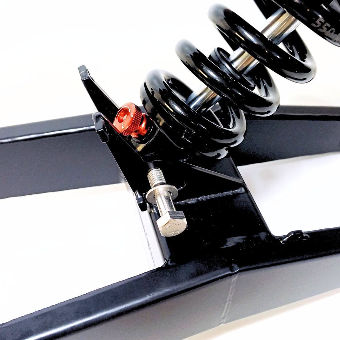 Nihajna roka vključuje dve pritrdilni točki za zadnji amortizer, kar omogoča prilagoditev različnim potrebam voznikov. Višja pritrdilna točka je zasnovana za težje voznike, saj preko večjega vzvoda zagotavlja večji upor proti stiskanju. Spodnja pritrdilna točka pa je idealna za lažje voznike. Priporočamo, da preizkusite oba položaja amortizerja in poiščete nastavitev, ki vam najbolje ustreza.